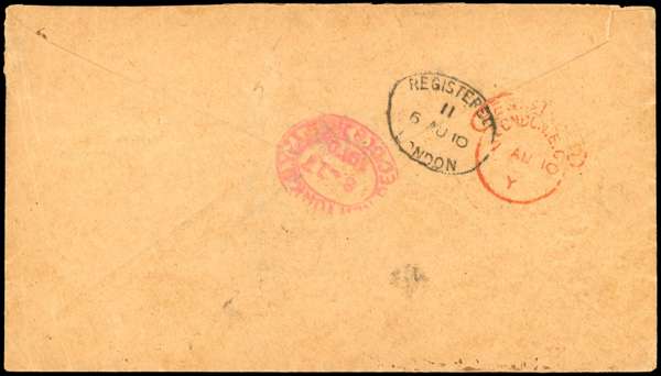 1910 registered cover to Stanley Gibbons, New York, USA, franked by 1904-12 ½d, 1d, 2d, and 6d, tied by Falkland Islands cds for JY 9 and backstamped by London registered marks for 6 and 7 AU and a New York arrival mark for 8-17. A few small peripheral imperfections, still an attractive quad-colour cover. SG 43/47.