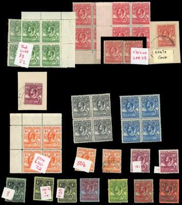 1929 Whale and Penguin set large part o.g., fine, with extras including some low values in blocks (no singles), and additional items including 4d line perf corner block o.g. (gum slightly two-toned and with faint foxed spots - despite the drawbacks, still a nice block), 6d line perf unmounted, and several used values. SG 116/126.