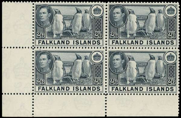 1937 printing of the 2/6d in slate, unmounted o.g. lower left corner block of four with diagnostic cracked gum. SG 160 (Heijtz 90, £400)