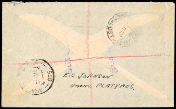 1942 registered airmail envelope to Sydney with two 3ds, cancelled solely by straight-line H.M.A.S. Melville in violet, another strike on registered label, and two strikes across the backflap. Sender on reverse, “E.C. Johnson HMAS Platypus”. Tombstone naval censor on front; reverse with APO 065 cancel of 3 JY 42 on reverse (based at Darwin)