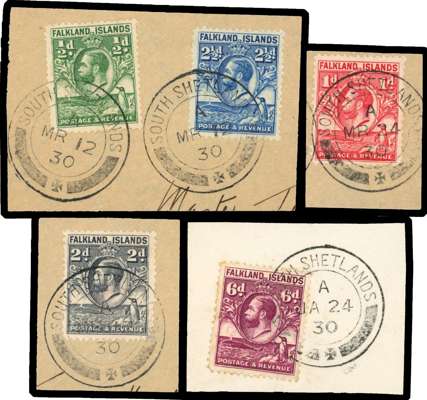 South Shetlands. 1929 Whale and Penguin ½d - 6d values used on pieces with 1930 dates. ½d and 2½d on a single piece with individual cancels, the others on separate pieces. The 6d with slight peripheral glue-staining, otherwise fine. SG Z149-153, £620.