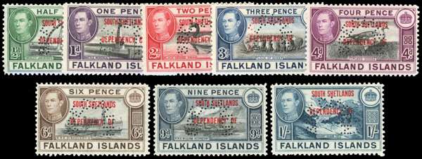 1944 South Shetlands set of eight perforated SPECIMEN Type B9, large part o.g., fine. SG D1s-8s, £650