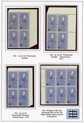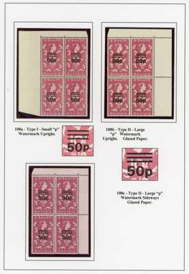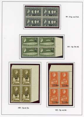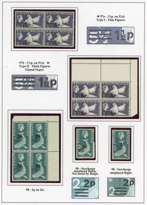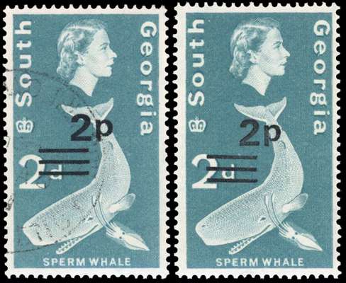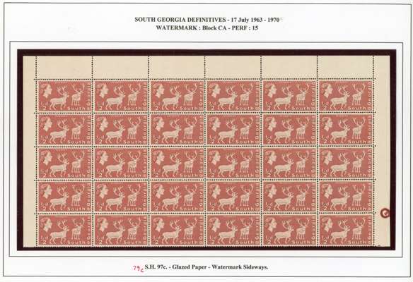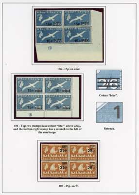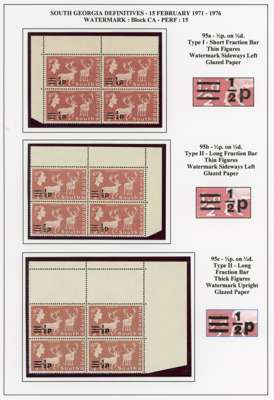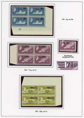 South Georgia 1963 set large part o.g.,1970 ½d watermark sideways top five rows, unmounted o.g., 1971-6 set in unmounted o.g. blocks of four with all Types/papers per SG, varieties including 2p on 2d surcharge misplaced below unmounted o.g., and misplaced to right fine used, 7½p misplaced to left unmounted o.g. SG 1/31b.