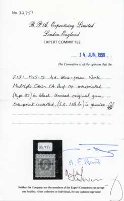 1915-19 ‘WAR STAMP’ ½d green, error Opt inverted, mint unmounted o.g. BPA cert (1990) as former SG 138b. SG 138c, cat £550.