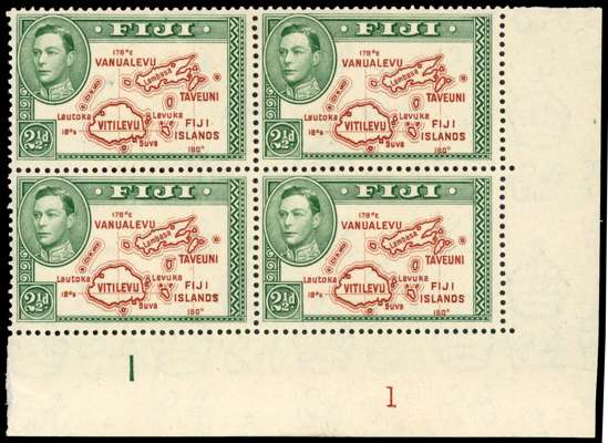 1942 2½d brown and green perf 13½ Plate 1-1 block of four, R9/6 Vatulele Curl and 10/5 extra island, lightly hinged on the selvedge only, otherwise unmounted o.g. SG 256ba, £150