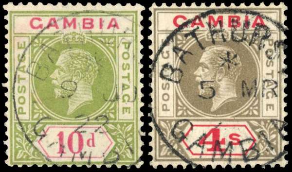 Gambia SG 116x, 117w 1921 10d and 4s watermark varieties used