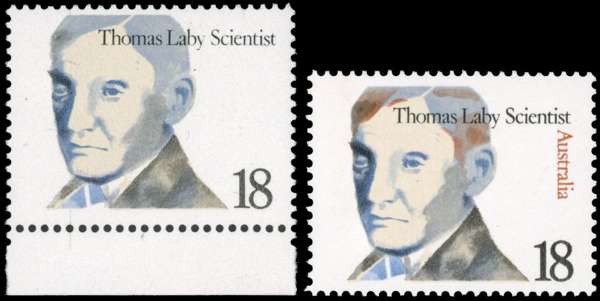 1976 Famous Australians 18c Thomas Laby, lower marginal example showing error red-brown (Australia etc.) omitted, mint unmounted o.g. Fine. Offered with normal for comparison. SG 638a, £800, BW 758c.