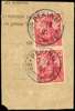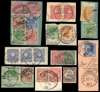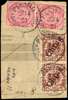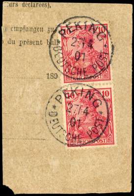 Small group with forerunner pieces including 5pf and 25pf combination, 1901 piece with pairs of China overprint 50pf together with pair 2m parcel stamp and on reverse pair unoverprinted 10pg Germania tied Peking DP cds of 27/4 01, Kiautschou 40pf cancelled large part Peking cds of 30/5 01; a couple of slight faults