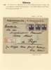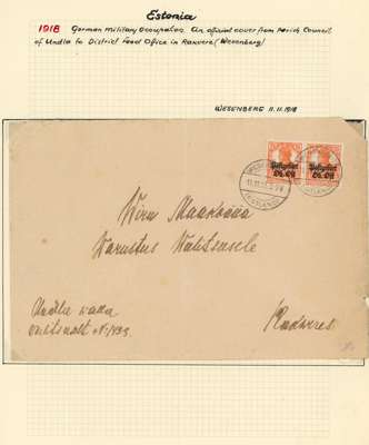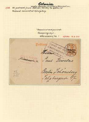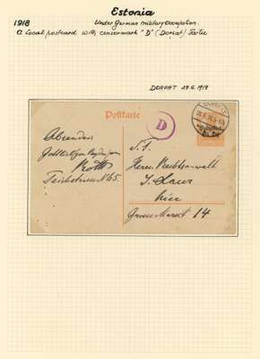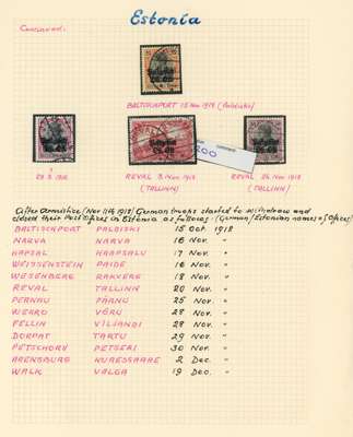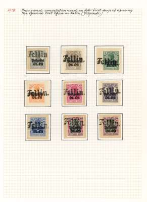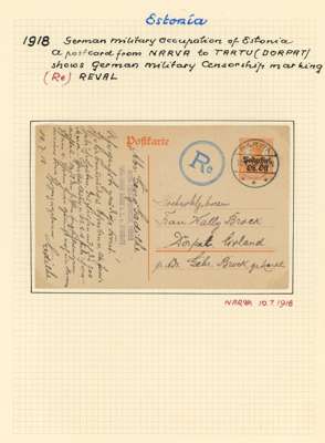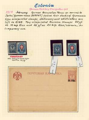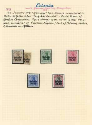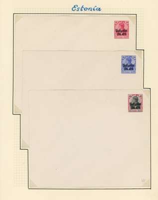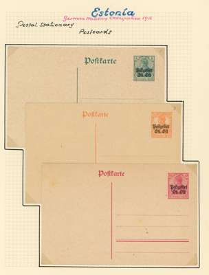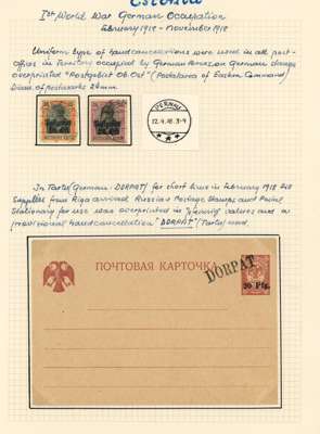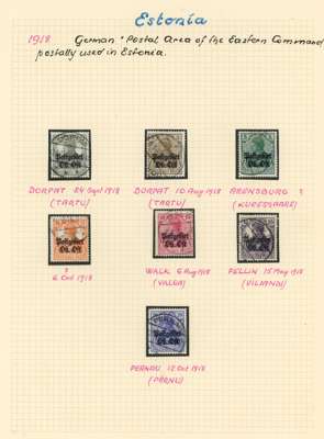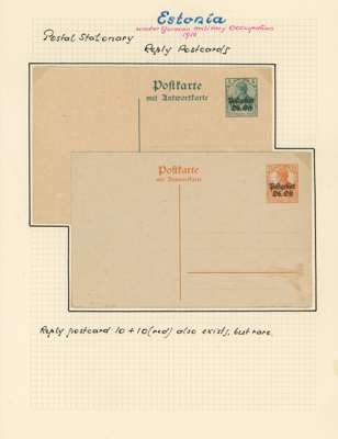 Collection on pages with 1918 Dorpat surcharge set of two unmounted o.g., the 40pfg on 20k small tone, 20pfg on 5k stationery unused and another cto with straight-line DORPAT handstamp, Germania overprints hinged o.g. and used, postal stationery cards and envelopes unused plus 7 ½pf cards used and 1918 registered cover to Riga franked three 15pf from Reval.