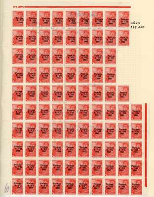 1941 type I 5k in irregular block of 93 showing constant varieties ‘broken 8’ (position 33) and ‘hook on 4’ (position 1), a fine block showing the different settings of overprint, fresh unmounted o.g.