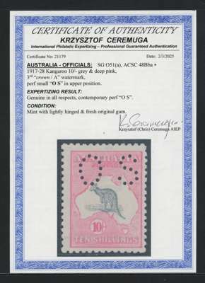 Official. 1915-28 10s grey and pink, wmk 6, type O2 ‘OS’ puncture, mint o.g., exceptionally fresh. Ceremuga cert (2025). SG O51, cat £1400