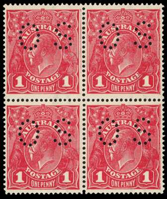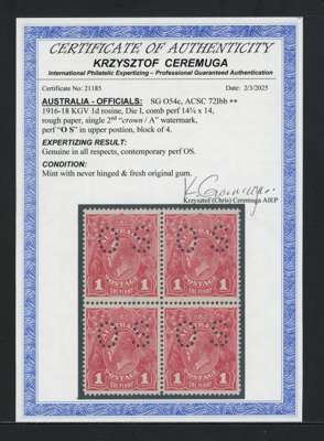 Official. 1916-20 1d rosine, die I, wmk 5, type O2 ‘OS’ puncture, block of 4, the lower right stamp with ‘saddle on emu’ flaw, mint unmounted o.g., a fine and very scarce multiple. Ceremuga cert (2025). SG O54c (BW 72Ibb/e, cat A$6000++)
