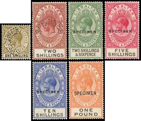 Gibraltar 1925-9 set of six, perforated or overprinted SPECIMEN, unmounted o.g. From the original printings, with appropriately dark gum. SG 102s-107s, £550