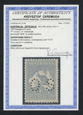 Official. 1923-24 £1 grey, wmk 6, type O2 ‘OS’ puncture, mint unmounted o.g., odd slightly shortish perfs but very scarce unmounted. SG O78 (BW 53b, cat A$4750)