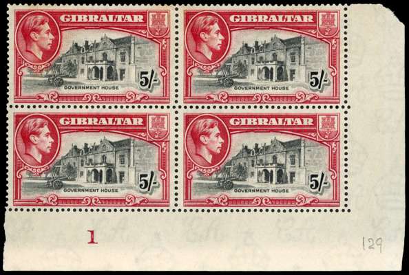 1938 5/- perf 14 lower right corner block of four with Frame Plate 1, unmounted o.g. Right selvedge with a minor bend, R9/6 with a small natural ungummed area; scarce. SG 129, £440