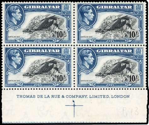 1938-51 10/- perf 13 imprint block of four, fine unmounted o.g. SG 130a, £180