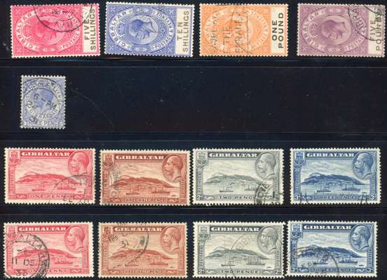 1855-1933 used collection with 43 GB used in Gibraltar, and Gibraltar issues (129), all used. The GB ‘used in’ a fair range; the later issues bordering on completion but with many faked cancels up to and including the £5. However, good material is to be found; Bermuda overprints plus 2½d blue-black overprint; 1886 set (1s faked cancel); 1889 surcharges plus 50c short foot to ‘5’; most of the subsequent low values are OK but the only ‘good’ high value is the 1924 8s. Mixed condition