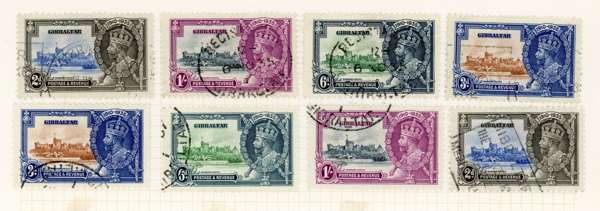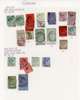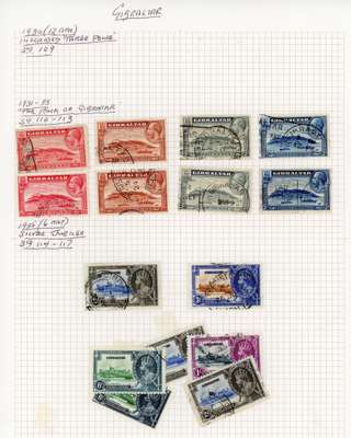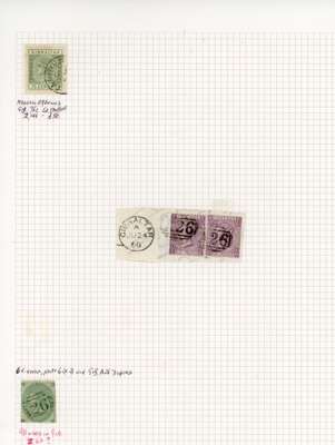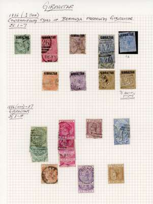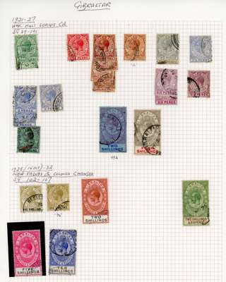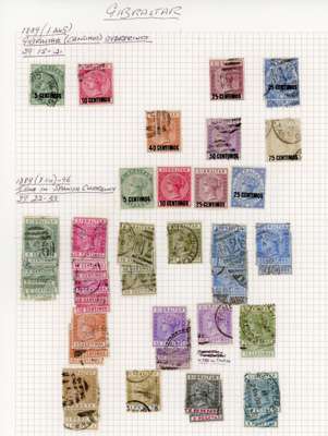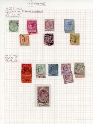 Collection on pages used from 1886 ½d to 1s with additional 1s Sperati forgery used, 1886-87 set with two 6d, the 1s with unclear cancels, 1889 surcharges with 75c faded, 1889-96 set used with two 5p, one with blue A26 obliterator, 1898 Sterling set, incomplete KEVII sets with 1903 4s, 1904-08 to two 2s, KGV with 8s plus £1 with forged cancel, 1925-32 5s and 10s used; fair to fine condition