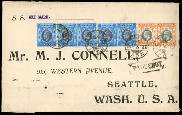 1906 printed 'M.J. Connell' cover to Seattle, USA, franked by 1904-06 Wmk MCA 5c (pair), and 1903 Wmk CA 10c (5, two pairs and a single), carried by SS 'Aki Maru' and cancelled in transit by four strikes of 'MOJI/31.7.06/JAPAN' cds with boxed 'PAQUEBOT' H/S below (Hosking 3229, rated 'rare'). Backstamped with Seattle 'AUG 16 1906' arrival machine cancel. Slight cover faults (slightly reduced at either end, flap missing), still really fine condition for such a rare and dramatic cover. SG 67, 79.