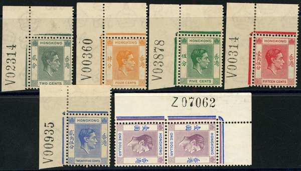 1938 original printings of the 2c, 4c, 5c, 15c and 25c in top left corner singles with Requisition letter ‘V’, o.g. with pre-war gum; and 1940 release of the $1 with Req. Z, top left corner vertical pair, unmounted o.g. SG 141/155