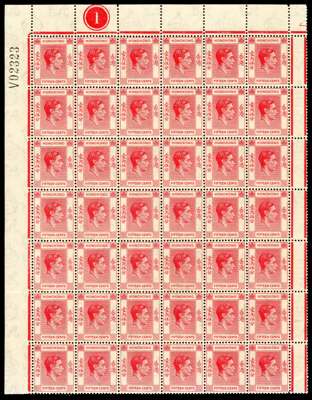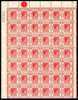 1938 15cscarlet top six rows of left pane fine o.g., stamps unmounted, with fresh gum for this. R6/6 broken characters (State 1), Requisition V outside R1/1. Unusual in a large multiple, ex Bennett. SG 146, a, £212