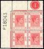 1951 20c rose-red top left corner block of four, unmounted o.g., with Requisition P and Plate 1. SG 148a, £112