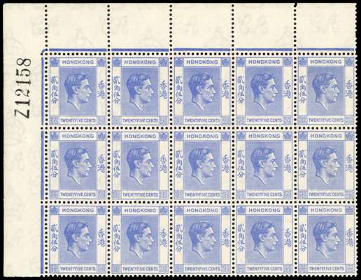 1938 25c bright blue top left corner block of fifteen with Requisition Z, fine unmounted o.g. SG 149, £435