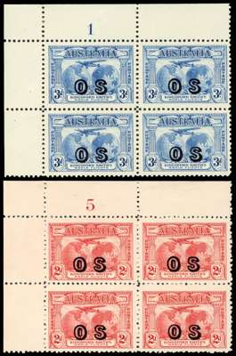 Official. 1931 (4 May) Kingsford Smith 2d rose-red and 3d blue, opt 'O S', upper left corner blocks of 4 with plate number ‘5’ (2d) or ‘1’ (3d), fresh mint unmounted o.g. (hinged in top margin), a superb and highly desirable pair from the special album presented to the Duke of Gloucester in 1934. SG O123/24 (BW 141(OS)/142(OS), cat A$9500+)