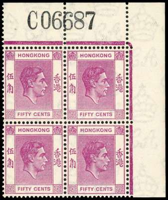 1945 50c deep magenta perf 14½ x 14 top right corner block of four with Requisition C. unmounted o.g. SG 153a, £120