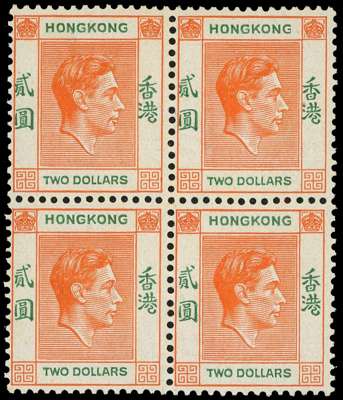 1928-45 $2 red-orange and green unmounted o.g. block of four, R3/3 LP sliced ‘G’ and 4/3 broken ‘O’ in DOLLARS. SG 157, £320