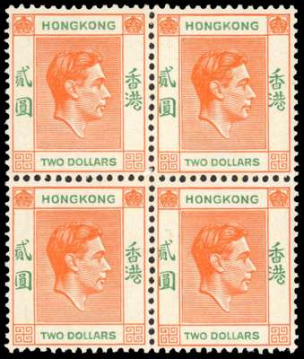 1938-40 $2 red-orange and green block of four, fresh unmounted o.g. Top left stamp with R4/3 LP damaged ‘O’ of KONG and ‘O’ of DOLLARS (H&A 72 and 90). SG 157 var, £320
