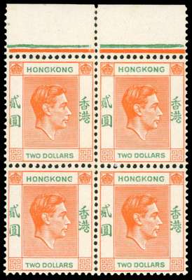 1938-40 $2 red-orange and green top marginal block of four, fresh unmounted o.g. Lower left stamp with major damage to ‘G’ of KONG from R2/3 LP (H&A 79). SG 157 var, £320