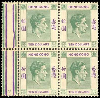 1938-40 $10 green and violet block of four with interpanneau selvedge at left, o.g., hinged on the top pair only. Good gum for this. SG 161, £3000