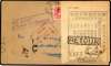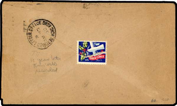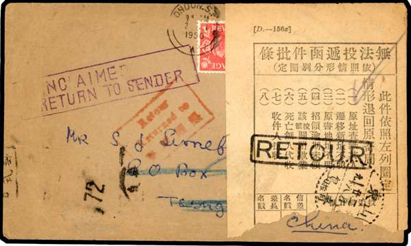 Postal History. 1950 envelope from London to Tsingtao, with two boxed Return to Sender markings and a Chinese label affixed to front, postmarked and with a further RETOUR handstamp. On reverse, a Christmas greetings label, and RETURNED LETTER OFFICE/ HONG KONG CDS of 28 MR 50, a very late use