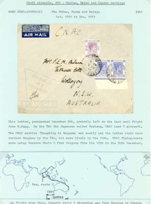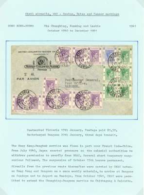 Postal History. 1941 airmail covers. 17 JA to Rangoon via Chungking, Kunming and Lashio, per CNAC; 5 DE to Australia (probably on the last mail flight before the invasion), triangular censor on face; FE 24 from France (20f50c rate) to Shanghai, black HK Censor label and the rare AIR TRANSIT 2 mark in blue, applied in HK; 7 MY from France (19f rate) , opened out for display, blue HK Censor label and AIR TRANSIT 4 mark in blue. Ex Ian Warn