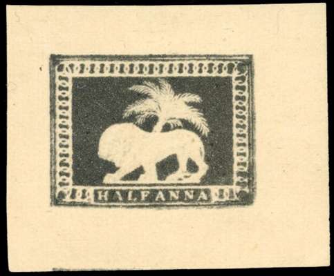 1890 ½a Lion & Palm Tree Essay, Die II, in black on yellowish wove paper, with watermark sideways ‘A’. Fine and scarce. Spence 31.
