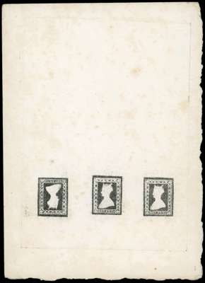 1922 1a Queen with Gothic Crown in black, die-sunk on stout white card, complete sheet (125x175mm) with the row of three; the left two in a tête-bêche pair. Some toning, of little importance as only four sheets of each colour were printed. Spence 12.