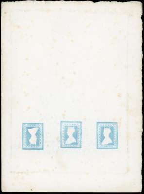 1922 1a Queen with Gothic Crown, in sky-blue, die-sunk on stout white card, complete sheet (125x170mm) with the row of three; the left two in a tête-bêche pair. Some toning of little importance, as only four sheets of each colour were printed. Spence 16