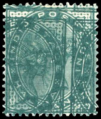 1882-90 ½a blue-green with double impression, mint large part o.g., a very fine example of this spectacular error. One sheet was discovered in Calcutta. SG 85a cat £1800