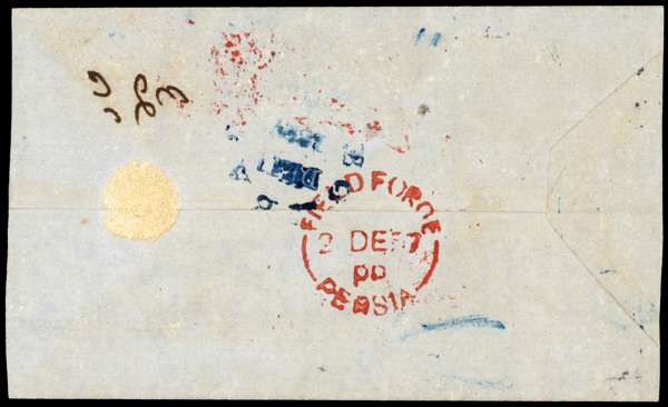 1856 stampless cover, addressed to India, bearing fine crisp strike from Field Force Persia for 2 DE 57 in red for 'postage paid' and Bombay arrival in blue, cover a little reduced otherwise fine, a scarce marking. See India Used Abroad by Jal Cooper (1972 pp 72-74)