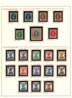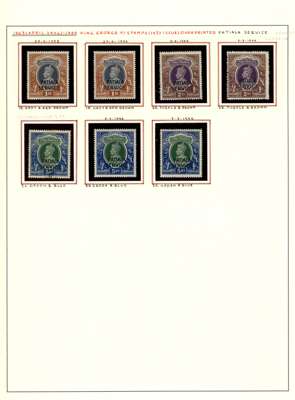 1937-46 mint collection (72) on leaves. 1937-38 set (fine), SG 99-102 (the rare 9p with black adhesions on reverse), White Background set; O63-84 complete with duplicates of the 1a on 1a 3p, SG O69-70a (10 in all, some minor defects) and 1943-4 1r-5r. Also 1944 5r with small part postmark, possibly genuinely cancelled. Cat £1,600+.