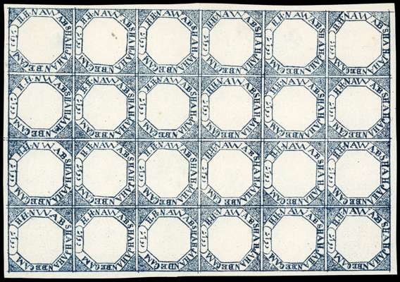 1881 2a black, complete unused sheet of twenty-four (4x6), no gum as issued, with R.6/2-4 NWAB for NAWAB. A few very minor marks and horizontal crease through row four, still desirable, especially as a complete sheet. SG 17, a.
