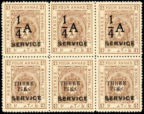 Officials. 1935-6 ¼a and 3p on 4a chocolate block of three vertical se-tenant pairs, patchy o.g., the lower right stamp with a tear. SG O323a, £600