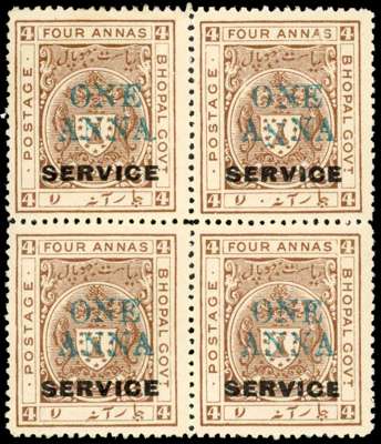 Officials. 1935-6 1a on 4a chocolate perf 14 block of four, top right stamp with inverted ‘N’. Unused with traces of gum, splitting, otherwise fine. SG O329b, ba, £634