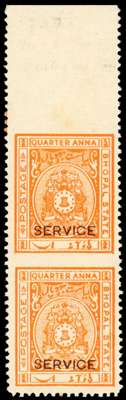 Officials. 1936-8 ¼a orange upper marginal pair, imperforate between and between top stamp and selvedge, large part o.g. Ex Ulrich and Harell. SG O333a, £300