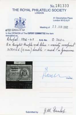 Officials. 1938 8a bright purple and blue, showing overprint double, fine used. RPS Certificate (2002). SG O340c, £350