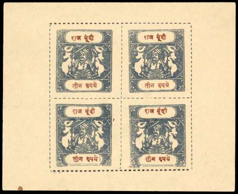 1917-41 3r grey-blue and chocolate sheet of four, tablet Type C, unused. Light overall toning and an inclusion at lower left. SG 47a, £480