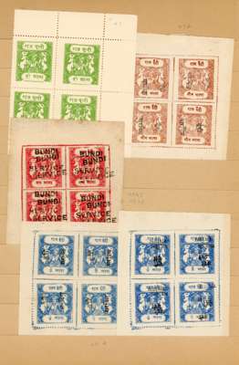 Officials. 1915-41 3a chestnut Type A unused sheet with Devanagari overprint sideways, light staining, mostly peripheral; 1a carmine Type B (one) and Type C (three) se-tenant, large English overprint double, some staining and slight splitting; 6a Type B two sheets, one with Devanagari overprint sideways, the other double, one inverted. Also non-Official 1a yellow-green Type H sheet with gum, unmounted, no left selvedge. SG O3A, O8bC, O17aC, O11A and 76