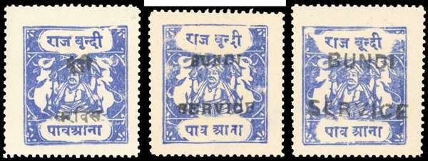 Officials. 1915-41 ¼a ultramarine tablet Type H, perf 11, three large part o.g. examples with the Devanagari, small English and large English overprints. Fine, ex Harell. SG O47A-C, £295