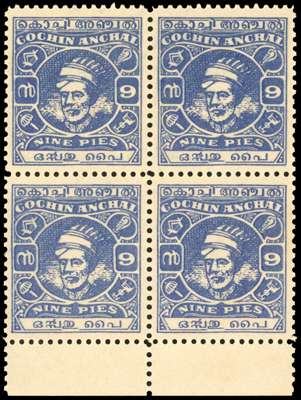 1943 9p ultramarine lower marginal block of four, watermark Government of Cochin, fine unused, without gum as issued. SG 89, £360